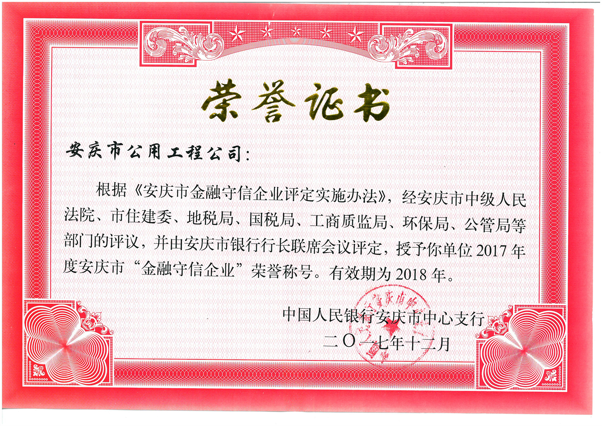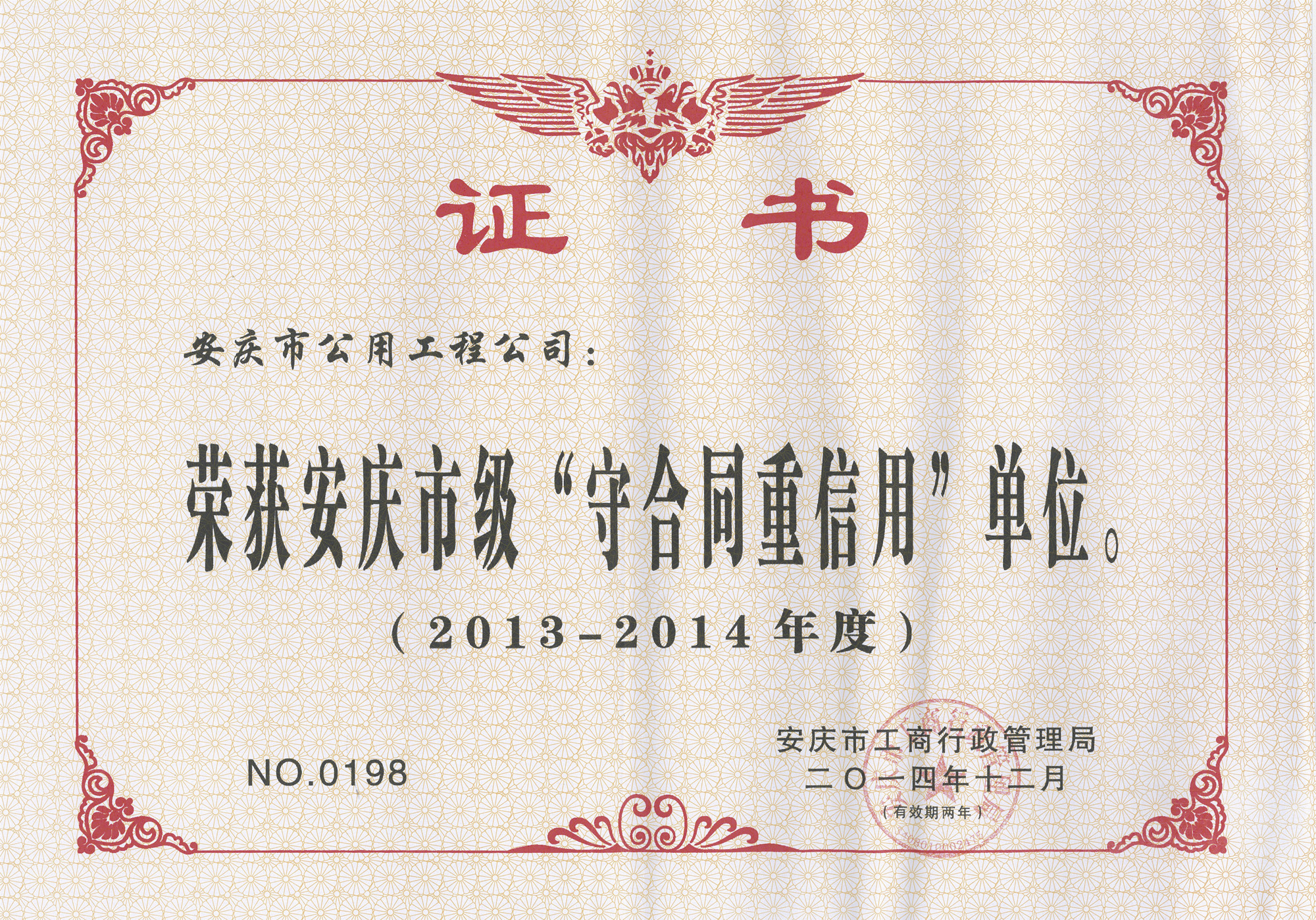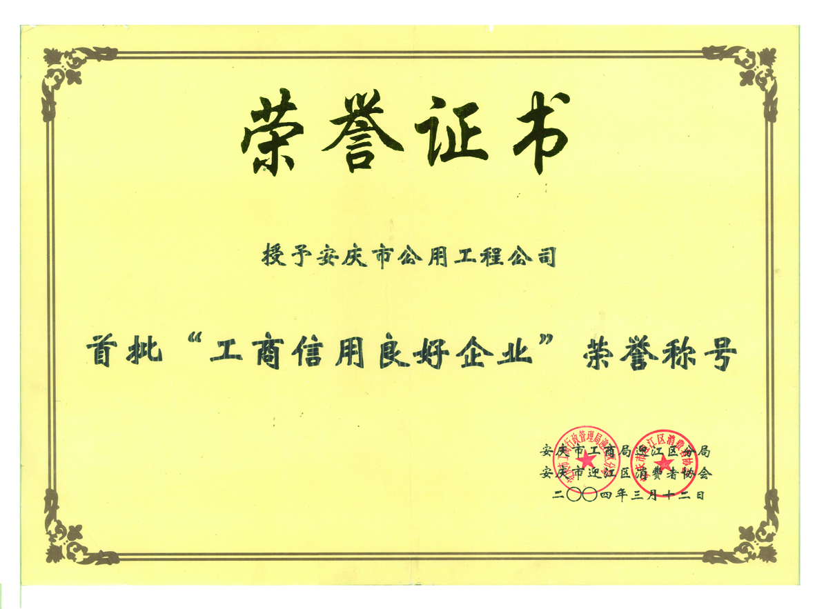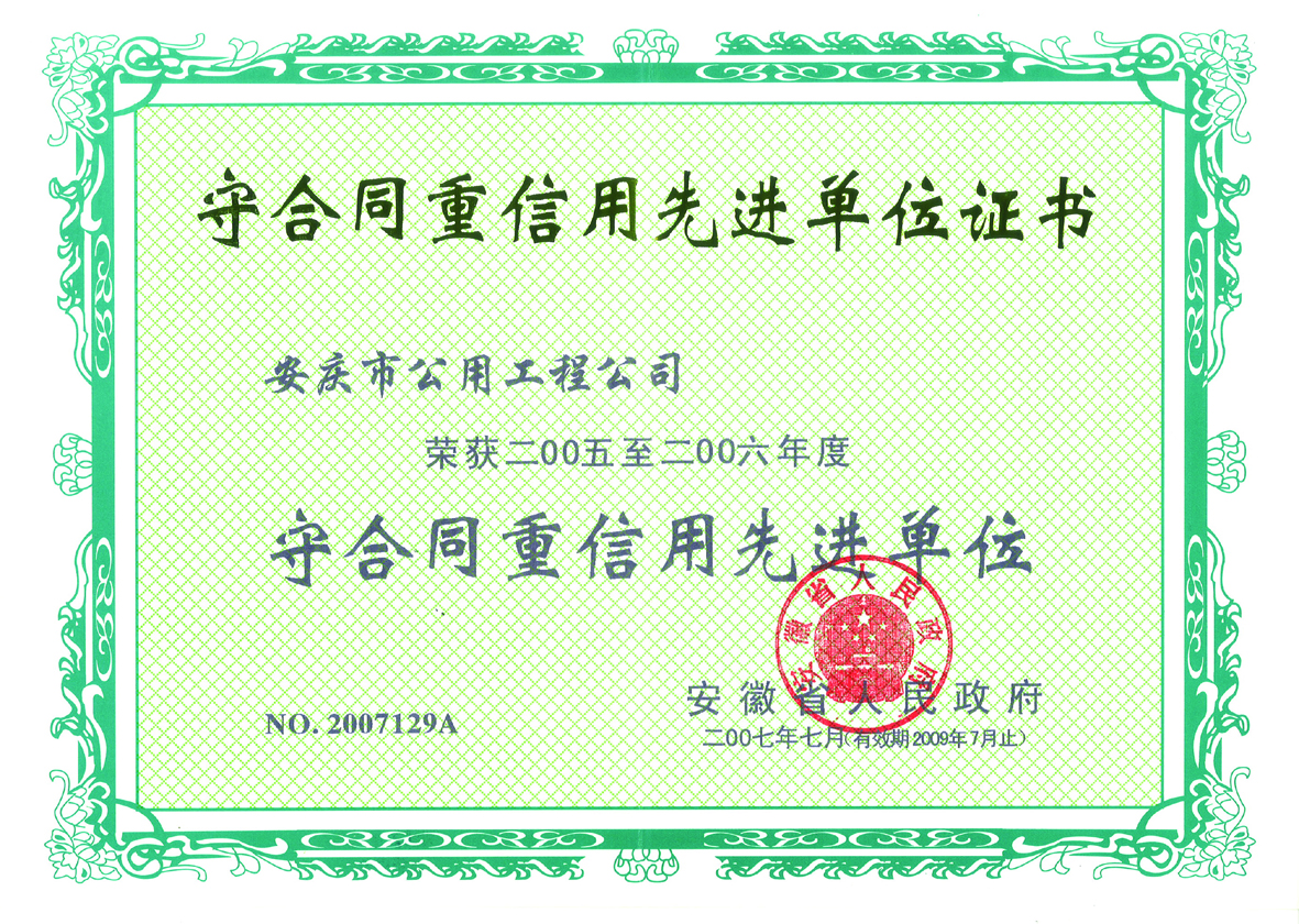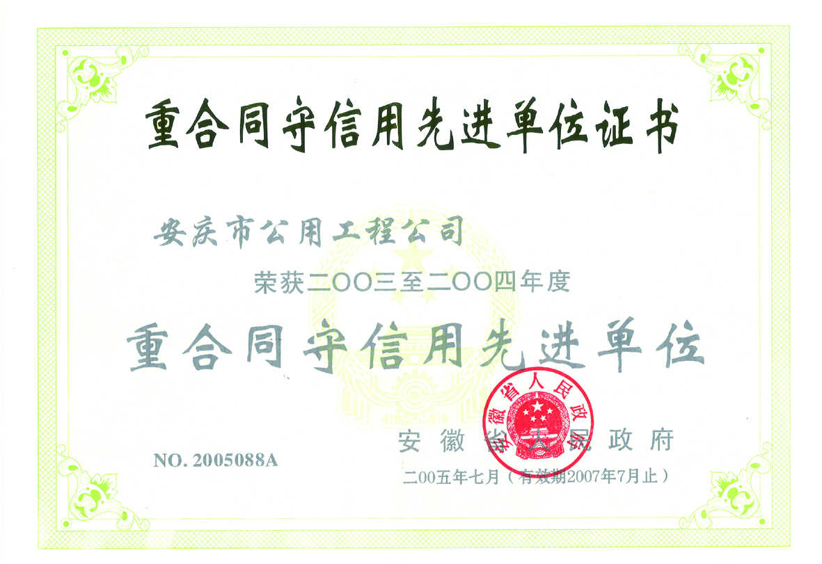守合同重信用先進(jìn)單位證書