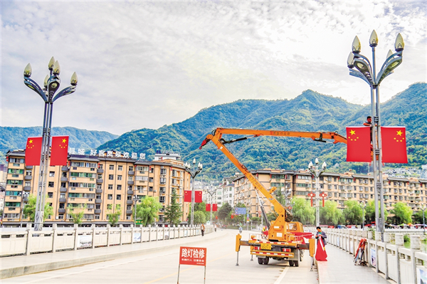 9月25日,紫陽(yáng)縣城區(qū)橋溝路的大道上,工人正在懸掛國(guó)旗。