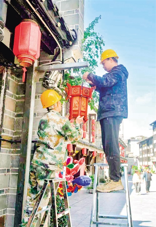 9月24日,石泉縣積極籌備國(guó)慶黃金周旅游服務(wù)保障工作。圖為石泉縣漢江古城景區(qū),工作人員正在更換景觀燈。