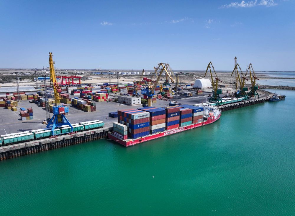 8月6日,一艘貨輪?吭诠_克斯坦阿克套港(無(wú)人機(jī)照片)。新華社記者 李任滋 攝