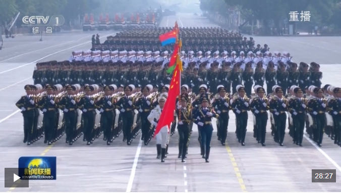 80響禮炮震徹云霄。全場齊聲高唱國歌,勝利紀念日的五星紅旗冉冉升起,飄揚在天安門廣場上空。
