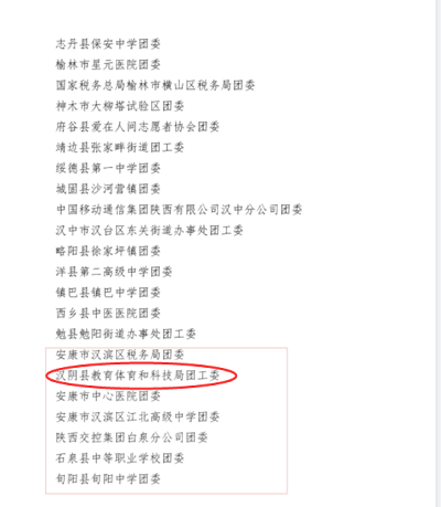 本網(wǎng)訊(通訊員 林愛銘)近日,共青團(tuán)陜西省委表彰了2020—2021年度“陜西省優(yōu)秀共青團(tuán)員”“陜西省優(yōu)秀共青團(tuán)干部”“陜西省五四紅旗團(tuán)支部”“陜西省五四紅旗團(tuán)委”,漢陰縣教育體育和科技局團(tuán)工委榜上有名,榮獲“陜西省五四紅旗團(tuán)委”榮譽(yù)稱號(hào)。