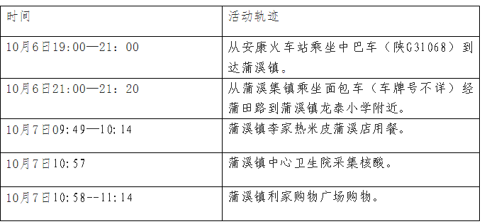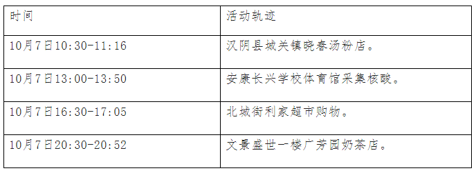 根據(jù)流調(diào)情況,現(xiàn)將外市核酸檢測(cè)陽性病例涉及密切接觸者在漢陰縣的公共場所活動(dòng)軌跡公布如下: